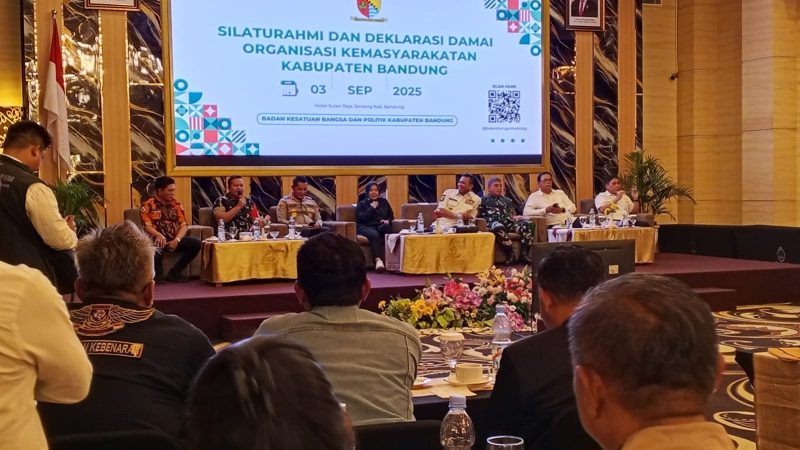 Kab. Bandung, Kontroversinews | Ratusan pimpinan organisasi masyarakat (Ormas) se-Kabupaten Bandung menghadiri kegiatan Silaturahmi dan Deklarasi Damai yang digelar di Hotel Sutanraja, Soreang, Rabu (3/9/25).